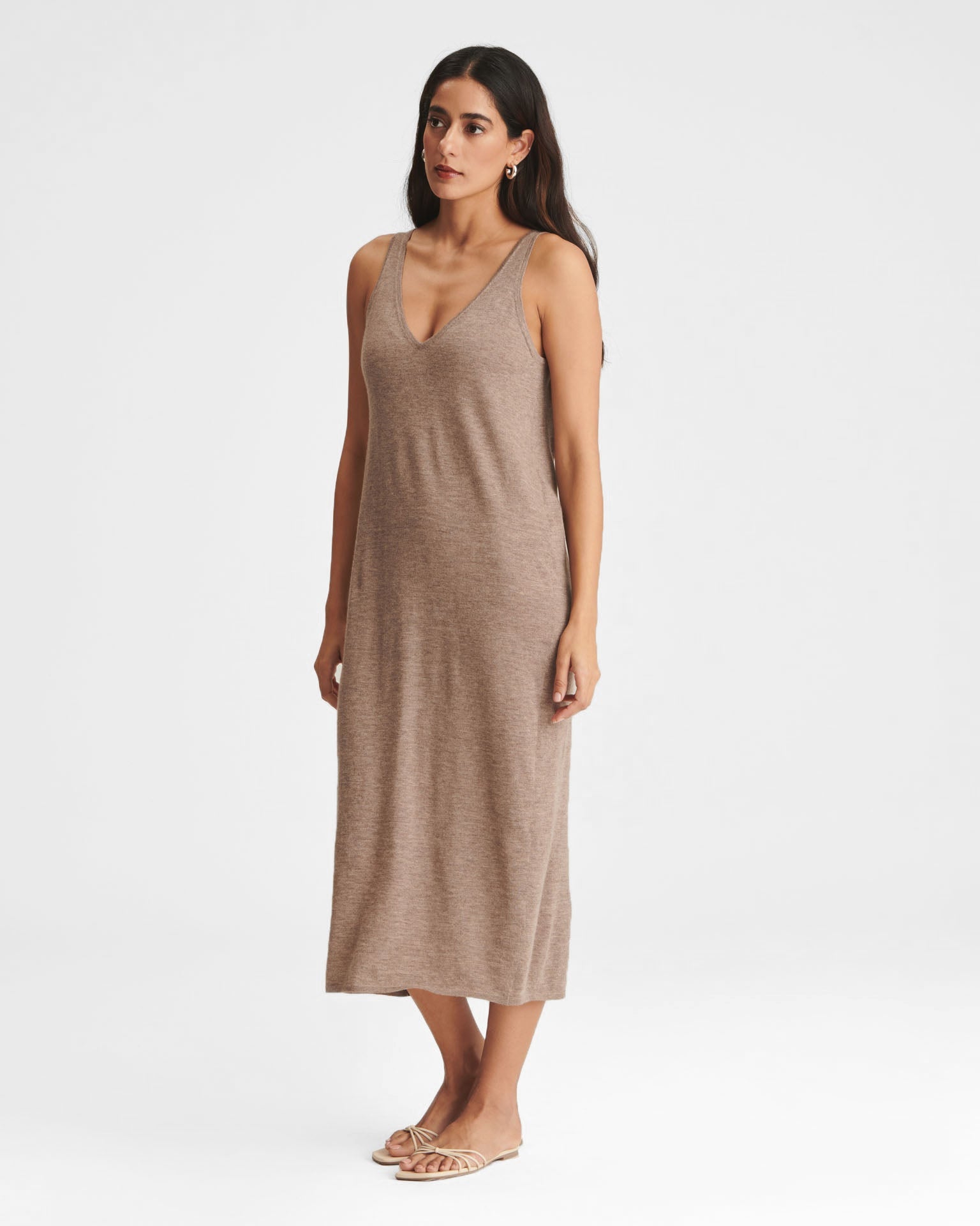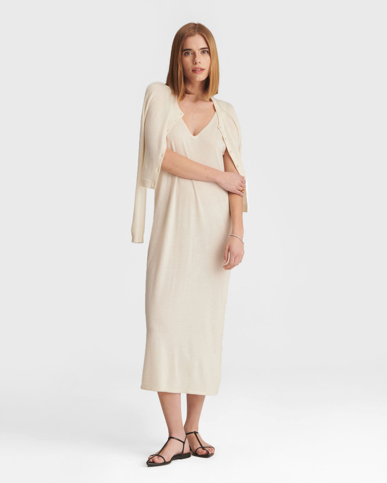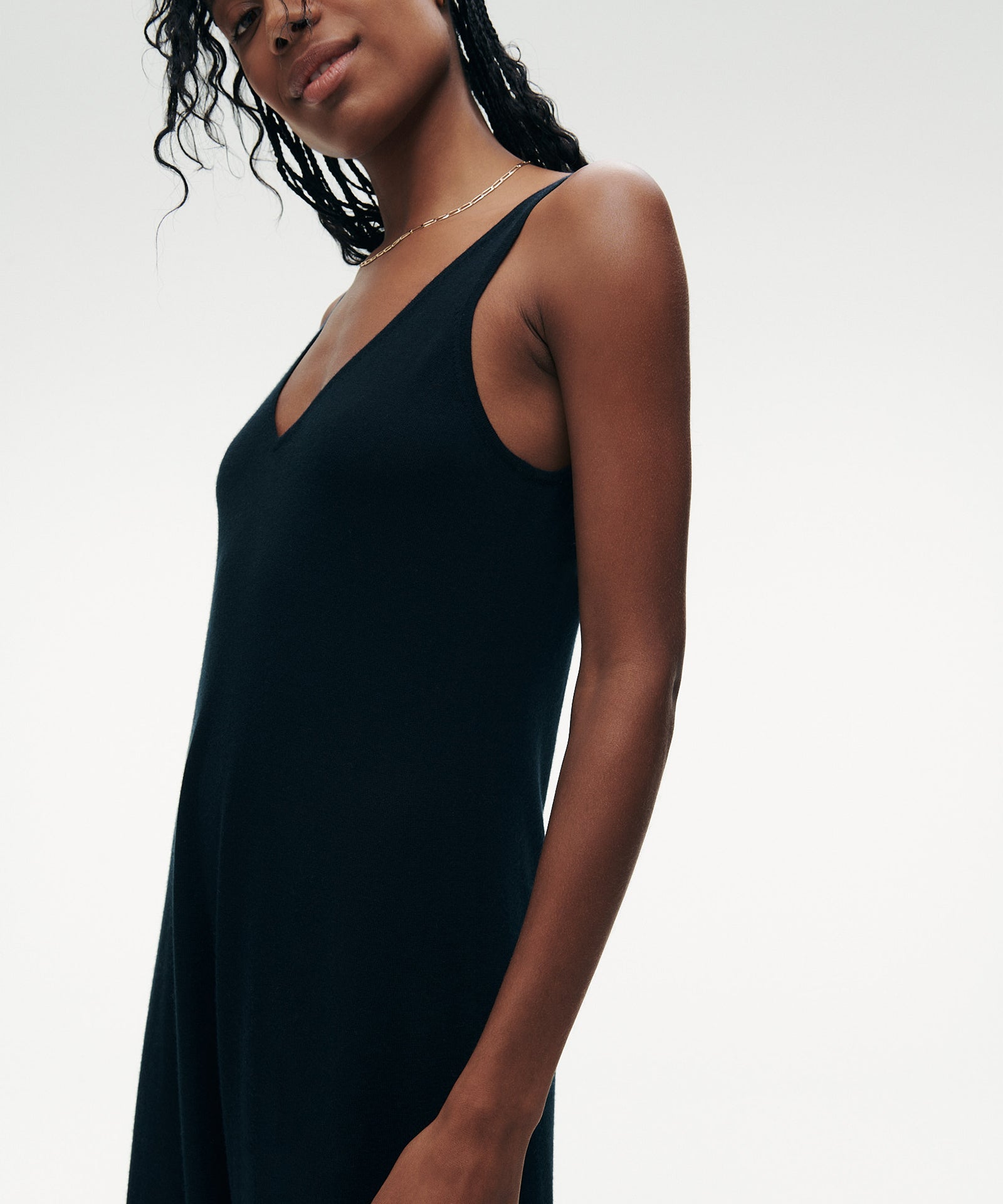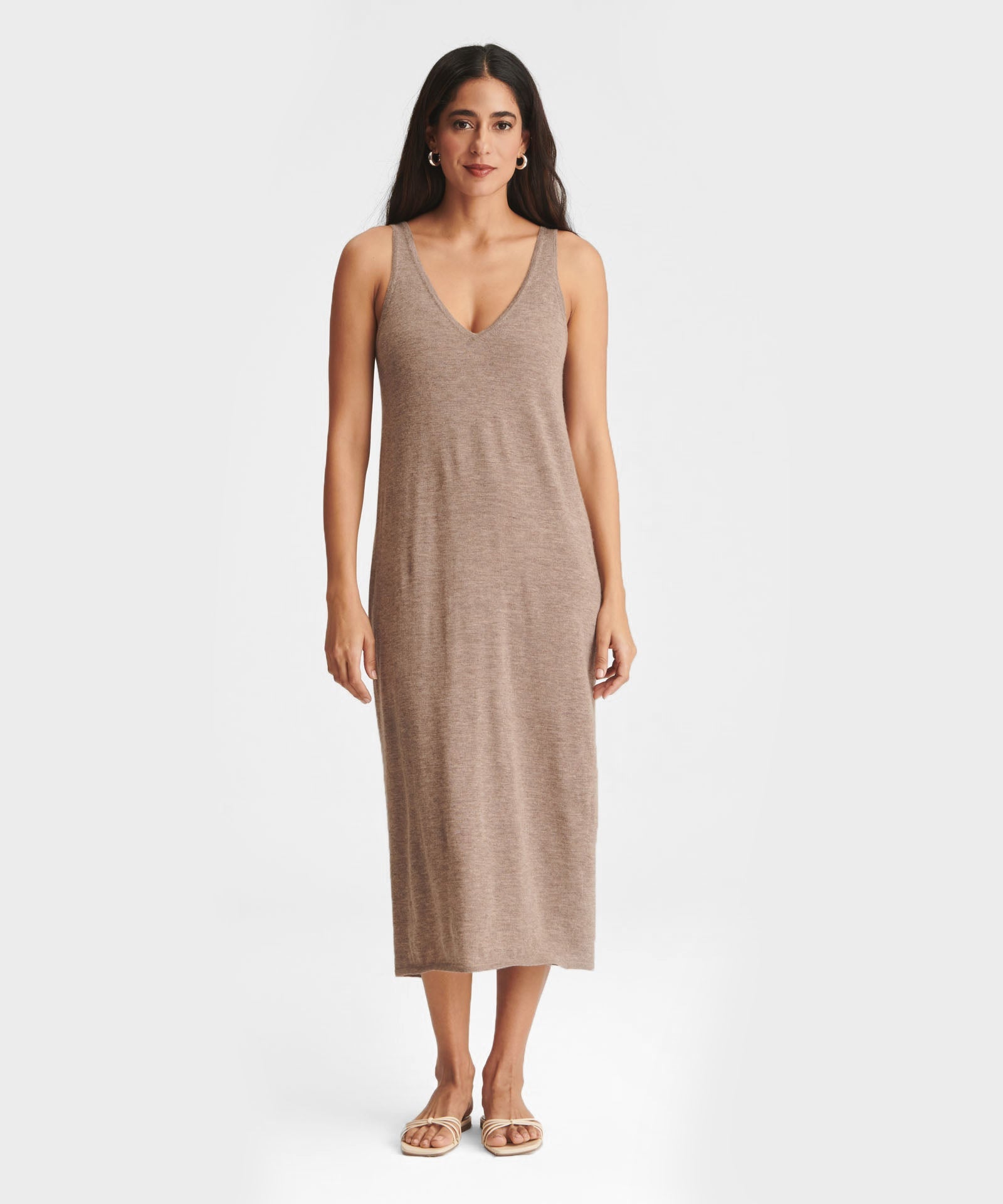 ?Qué elegante! El vestido de tirantes Fancy Cashmere es un vestido midi ligero y lujoso con un corte clásico. Presenta un escote en V pronunciado, bordes ribeteados y un dise?o chic y natural. Confeccionado en Fancy Cashmere: nuestra cachemira premium de 16gg, tejida con maquinaria de vanguardia. Es extrafina, suave como la seda y súper elegante.