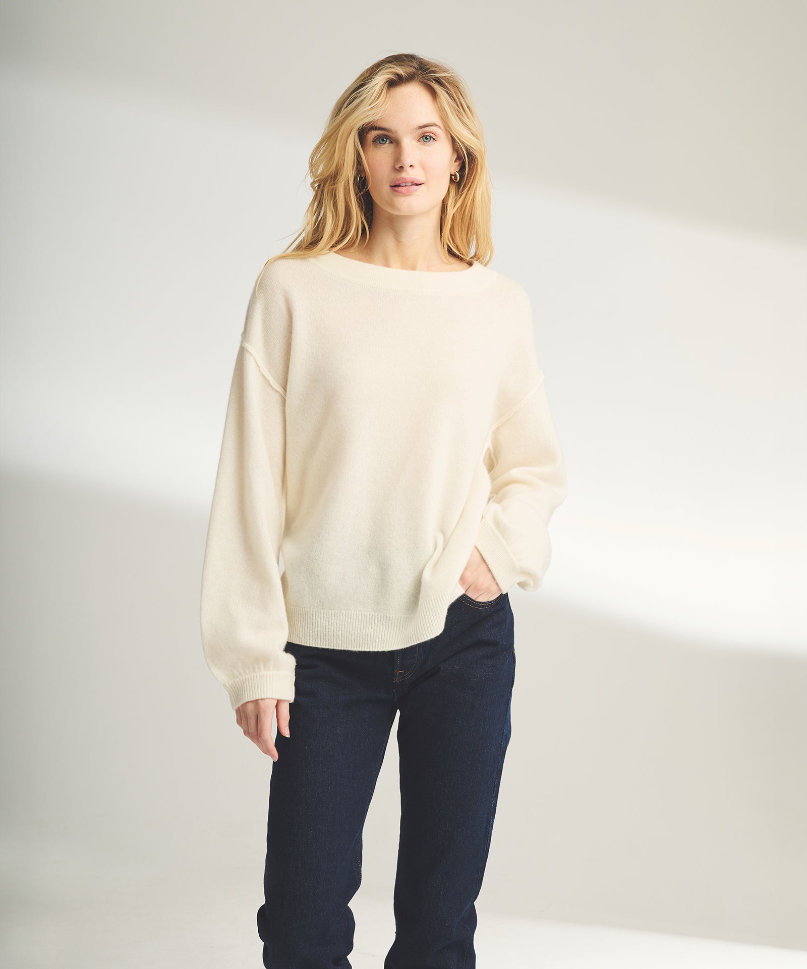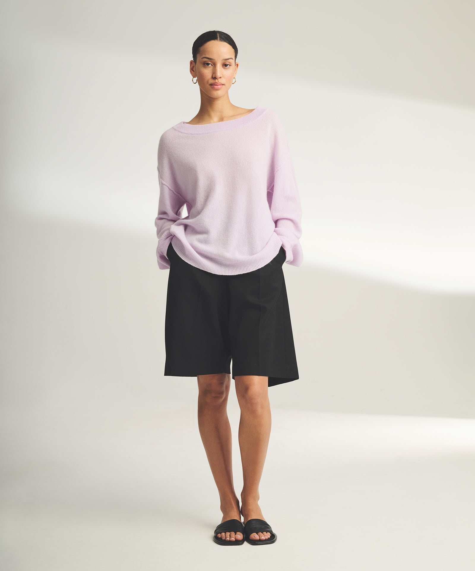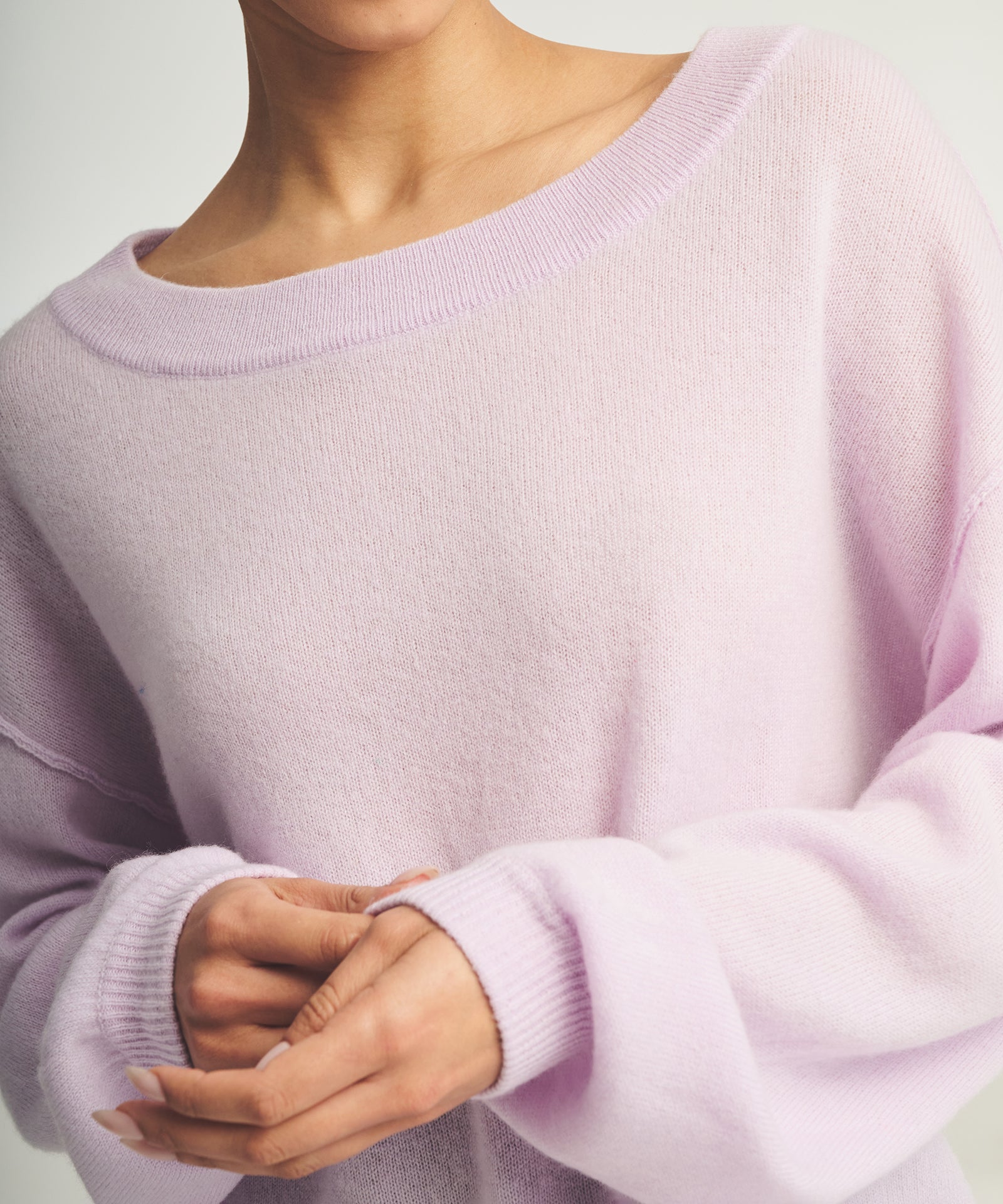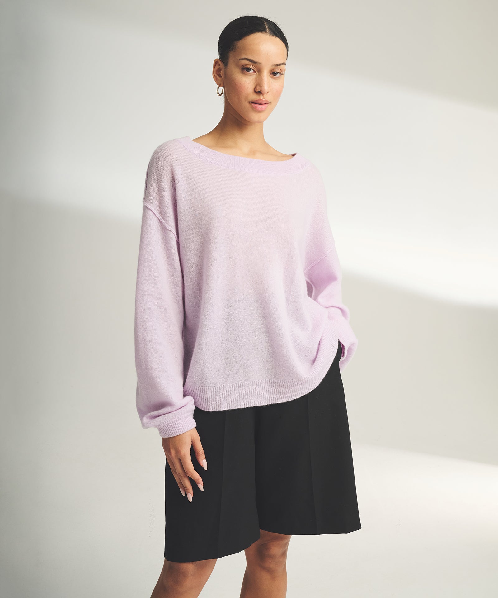 El suéter reversible de cachemira de cuello ancho es un tejido dos en uno con un corte oversize y un largo clásico, dise?ado para quedar a la altura de la cadera. Presenta escote barco, hombros caídos, mangas globo sutiles y una construcción totalmente reversible, para que puedas usarlo con las costuras por dentro o por fuera. Confeccionado en cachemira 100 % ligera y vaporosa.