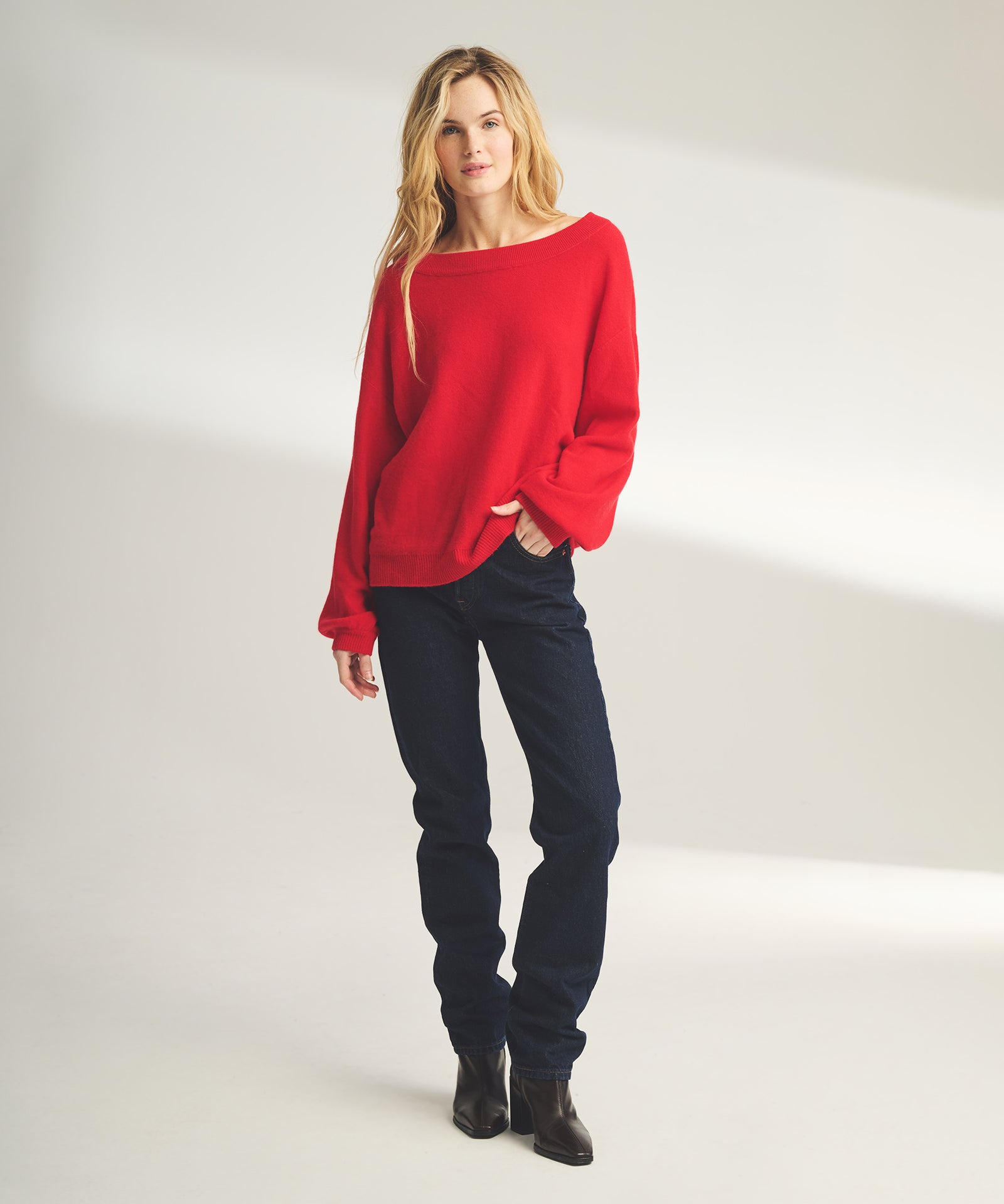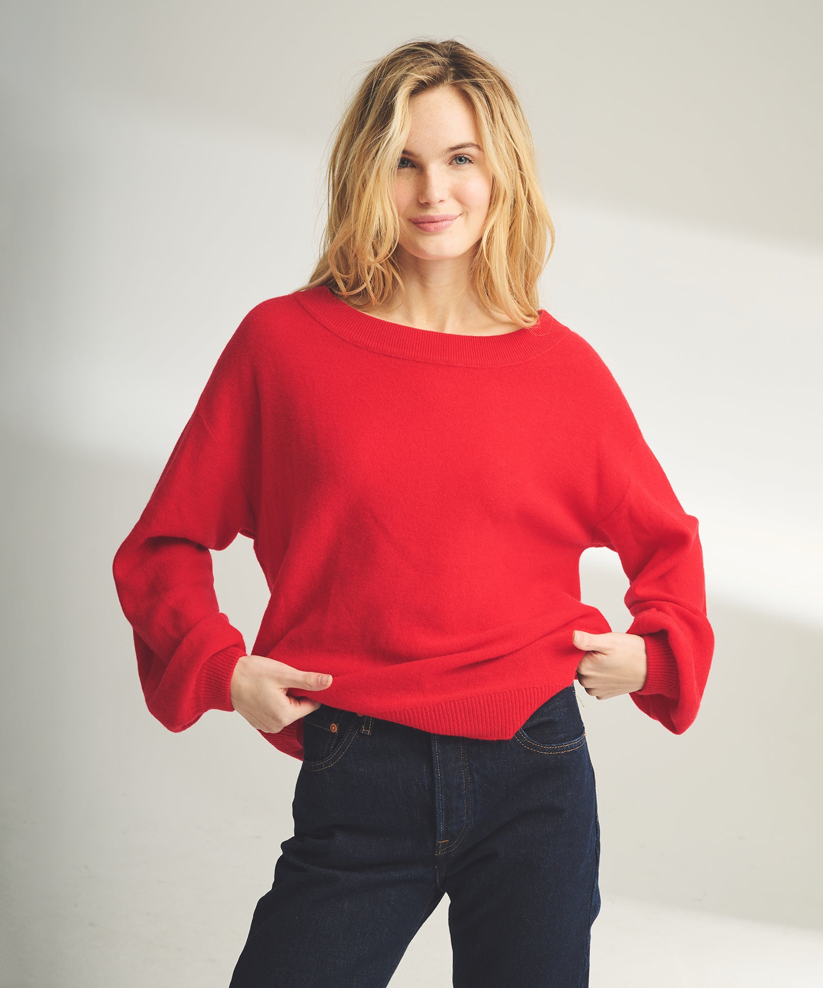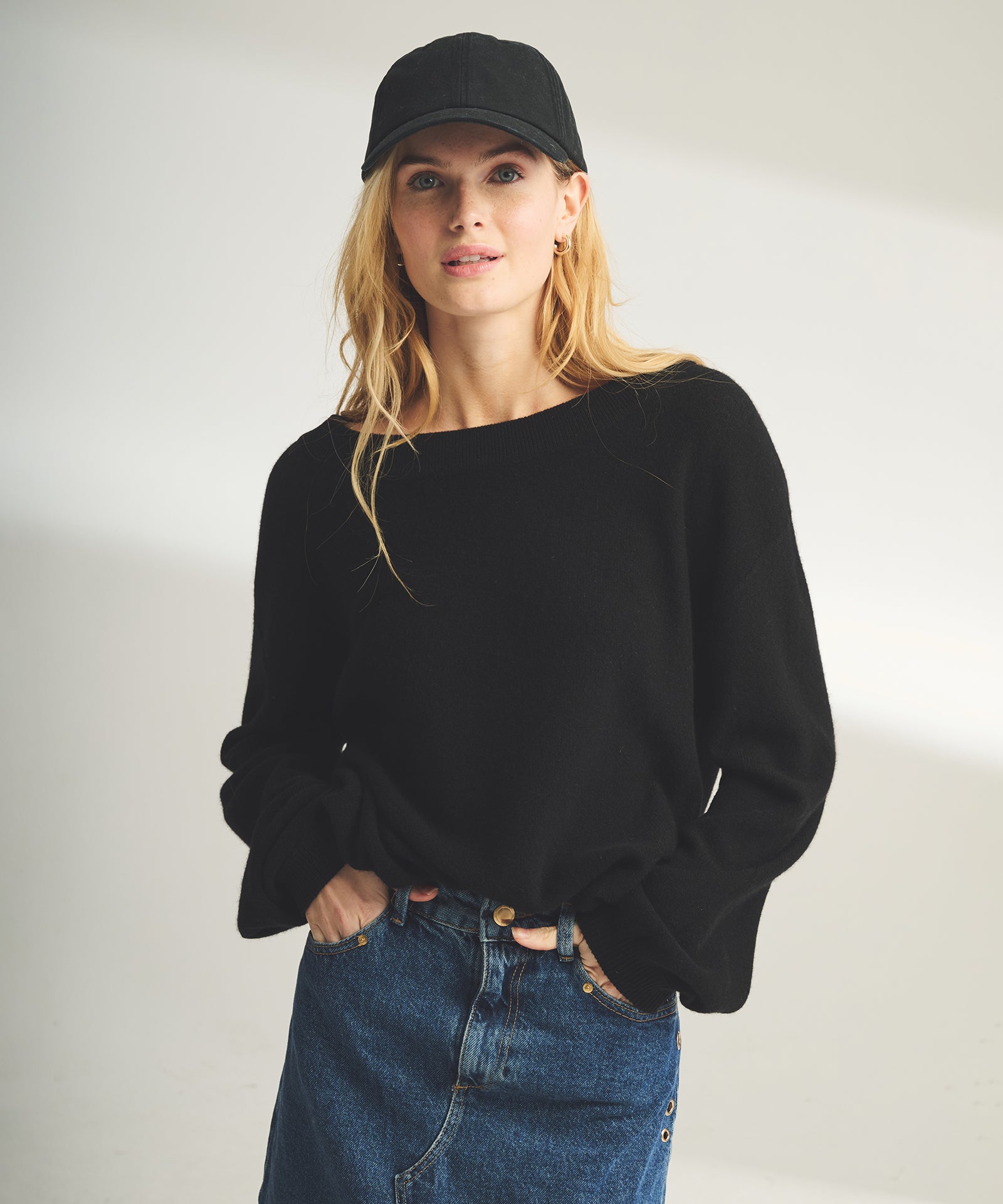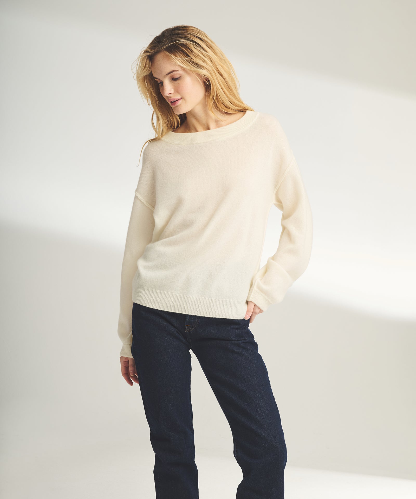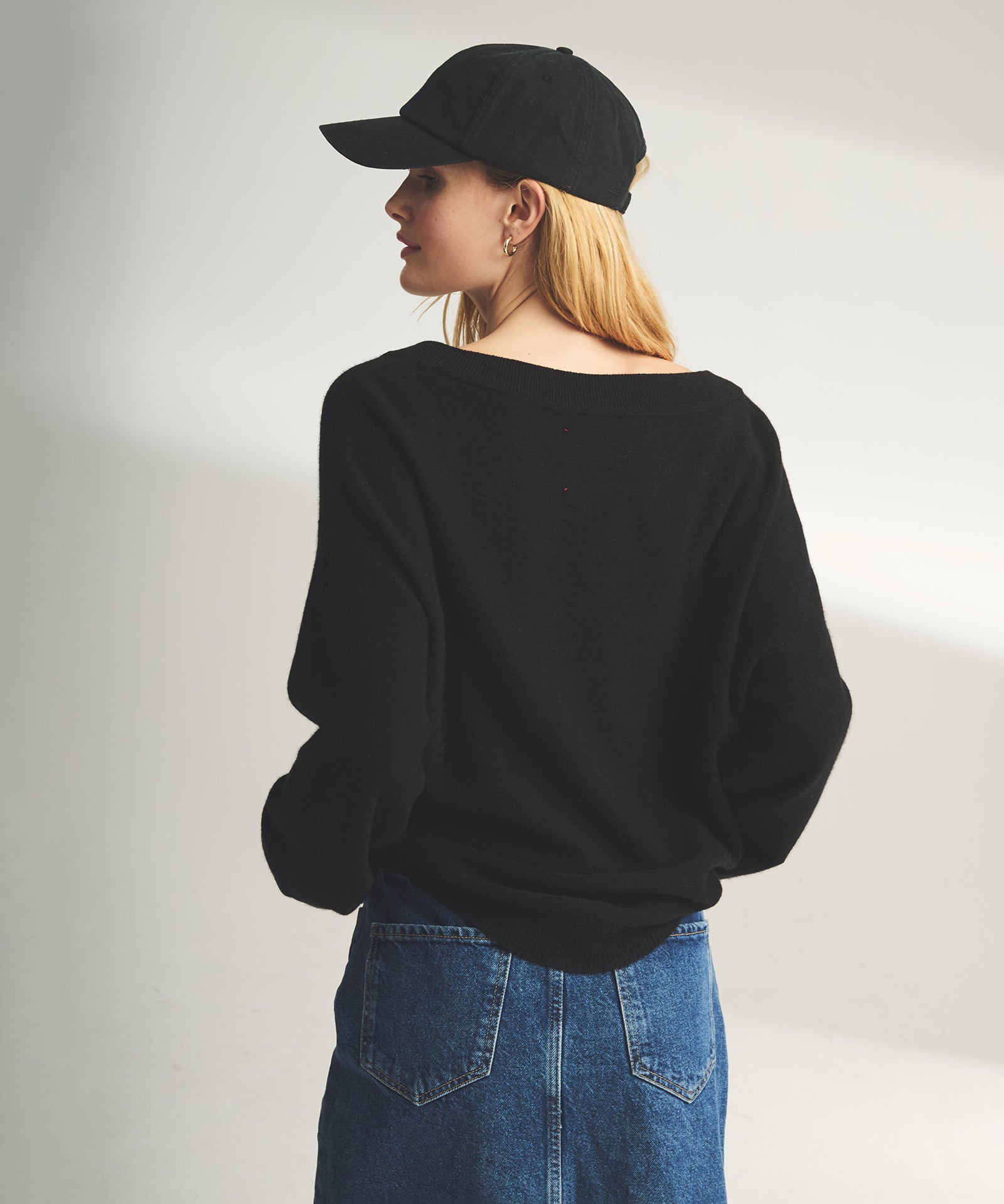 El suéter reversible de cachemira de cuello ancho es un tejido dos en uno con un corte oversize y un largo clásico, dise?ado para quedar a la altura de la cadera. Presenta escote barco, hombros caídos, mangas globo sutiles y una construcción totalmente reversible, para que puedas usarlo con las costuras por dentro o por fuera. Confeccionado en cachemira 100 % ligera y vaporosa.