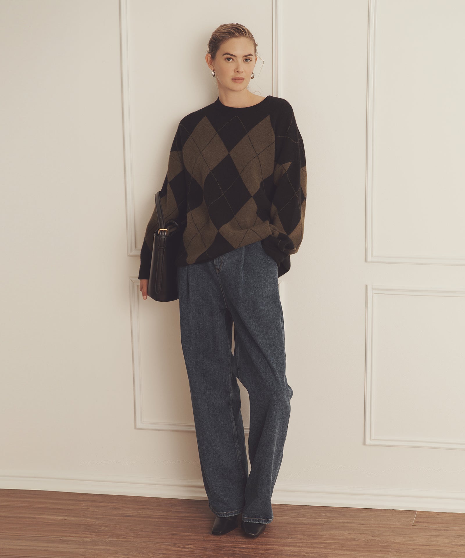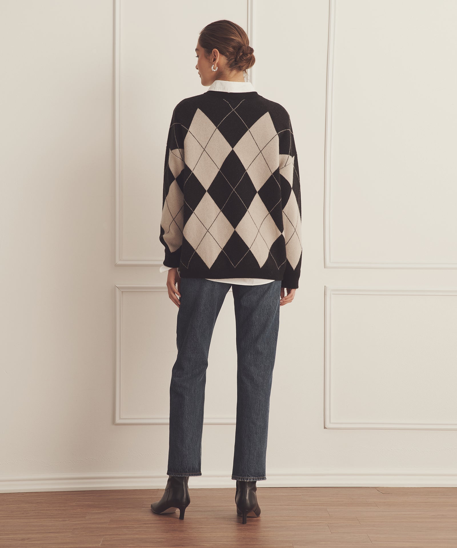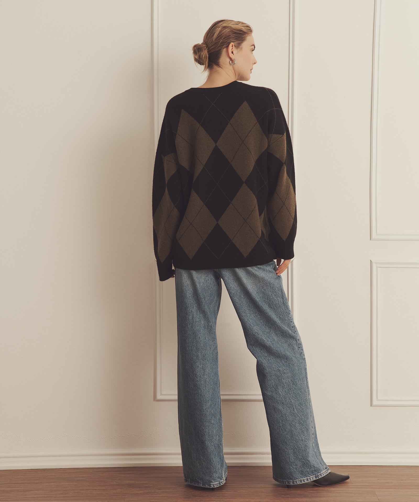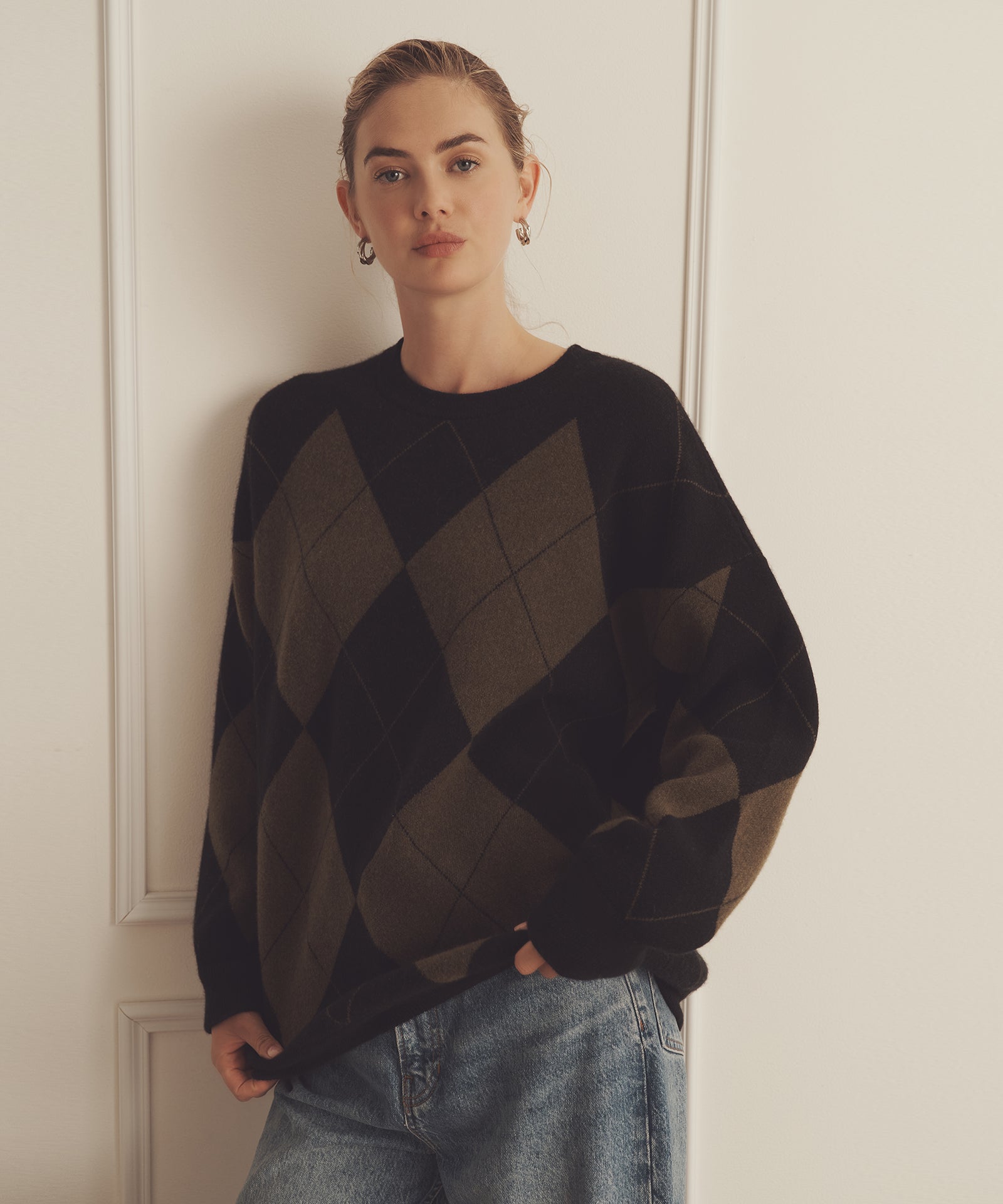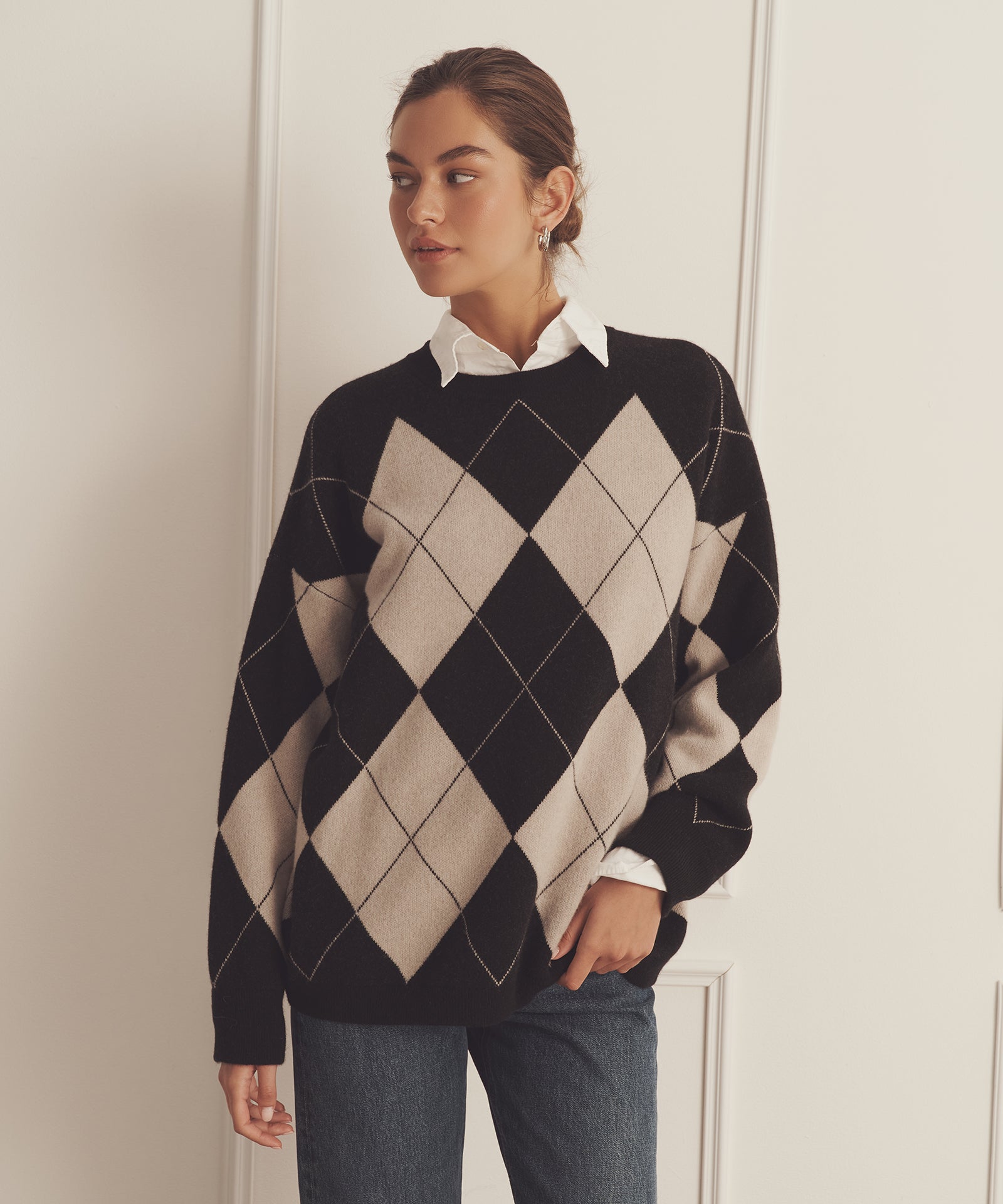 Pásalo. El jersey de cuello redondo Luxe Cashmere Argyle es un tejido de inspiración tradicional con un corte oversize y largo tipo túnica. Presenta cuello redondo, hombros caídos, detalles acanalados y un gran motivo de rombos. Confeccionado en Luxe Cashmere: nuestro cachemir más lujoso y afelpado del mercado.