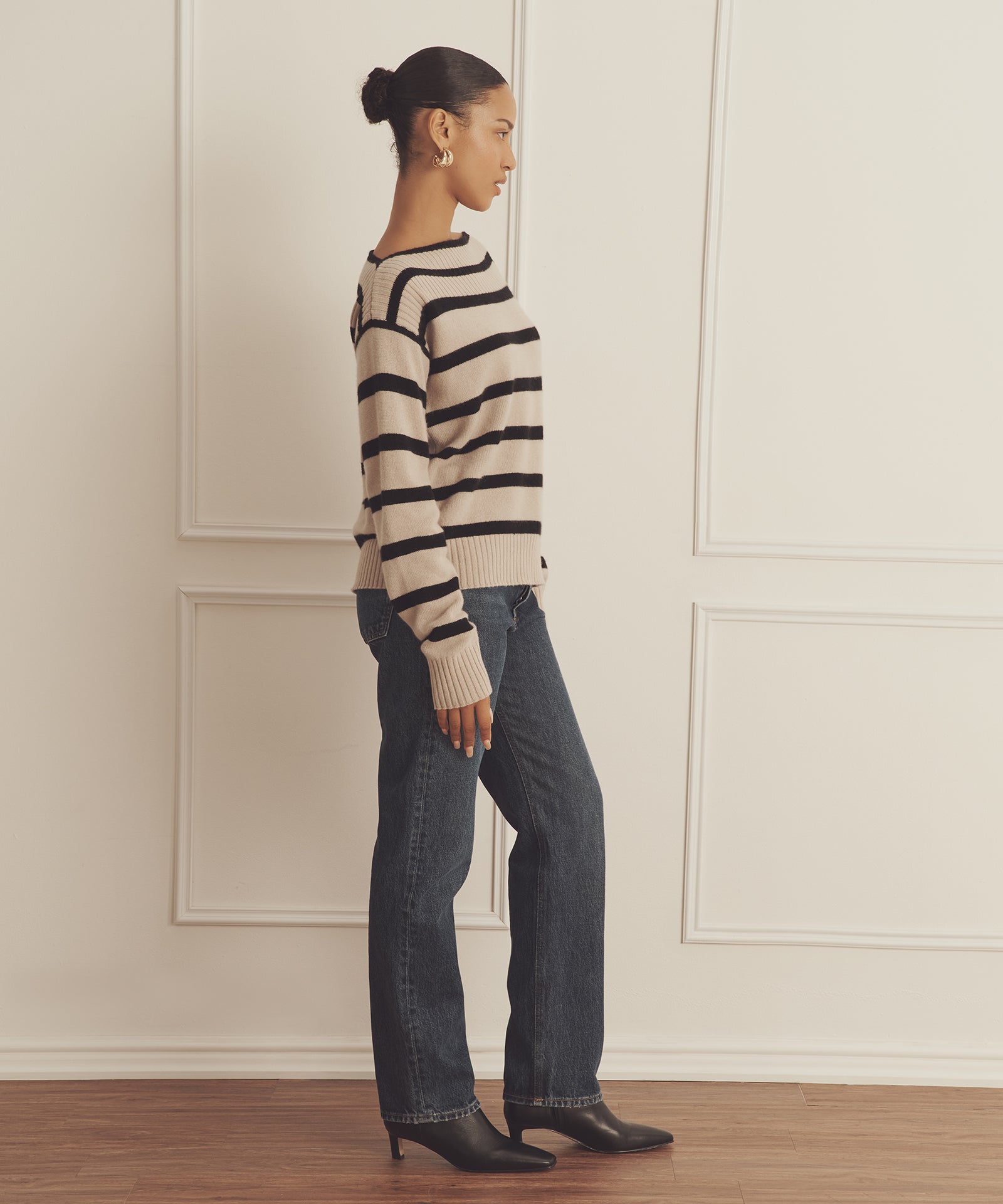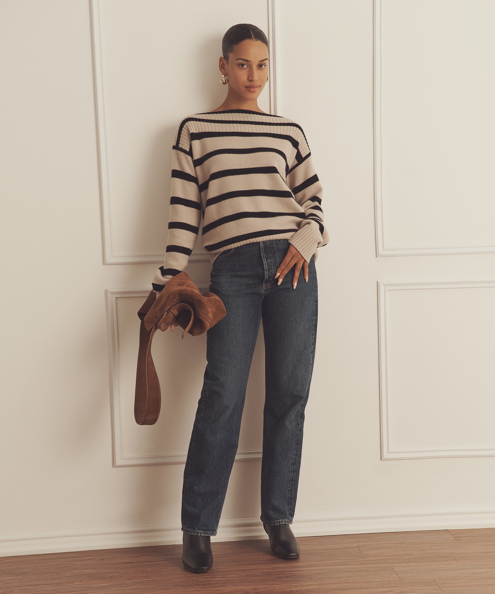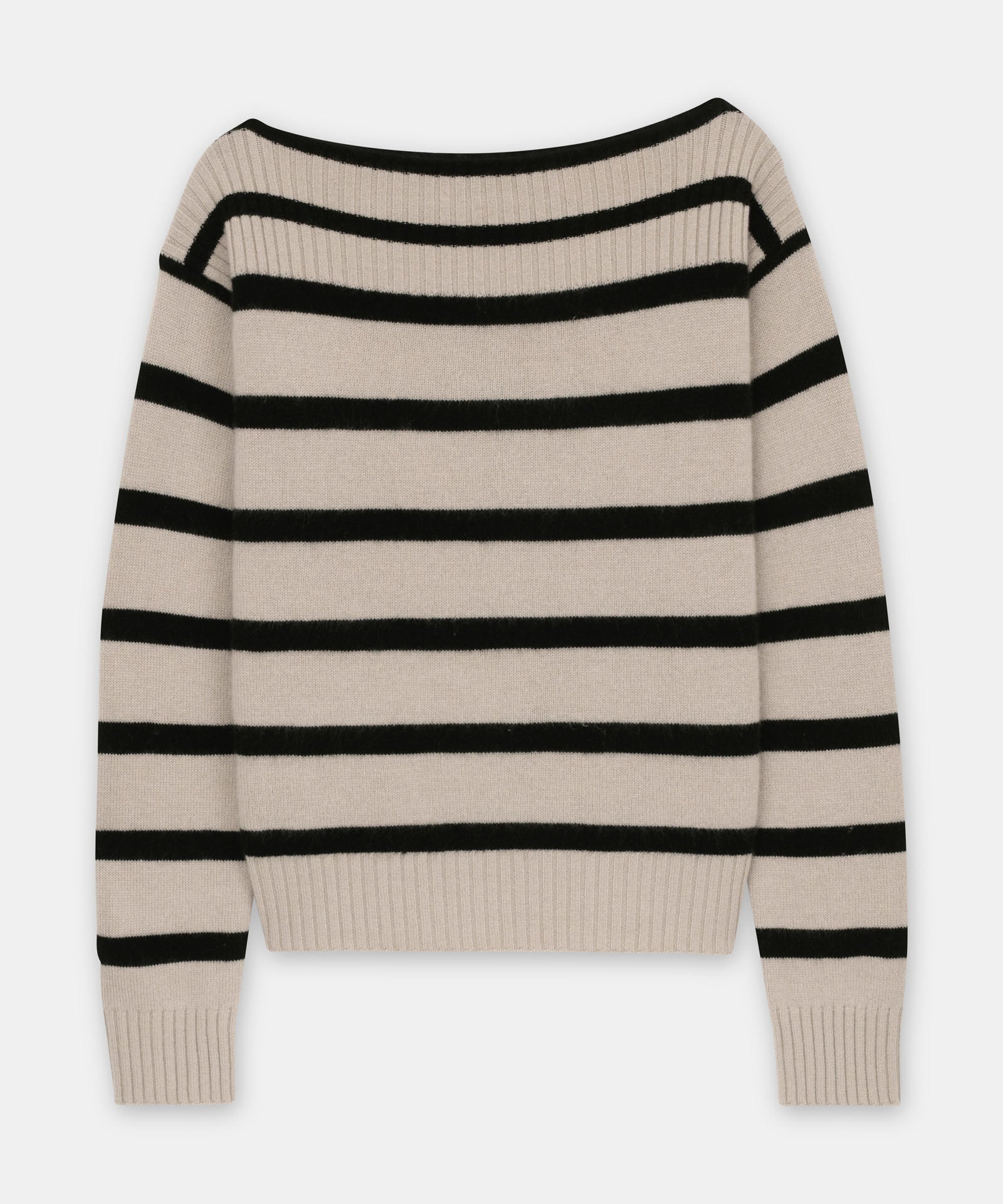 El jersey de cuello barco a rayas de cachemira de lujo es una prenda suntuosamente suave con un corte clásico relajado y un largo clásico. Presenta un amplio escote barco, hombros caídos y un estampado de rayas. Cada una de nuestras prendas de cachemira de lujo está tejida con un 100 % de cachemira sostenible de primera calidad y un peso de lujo considerable.