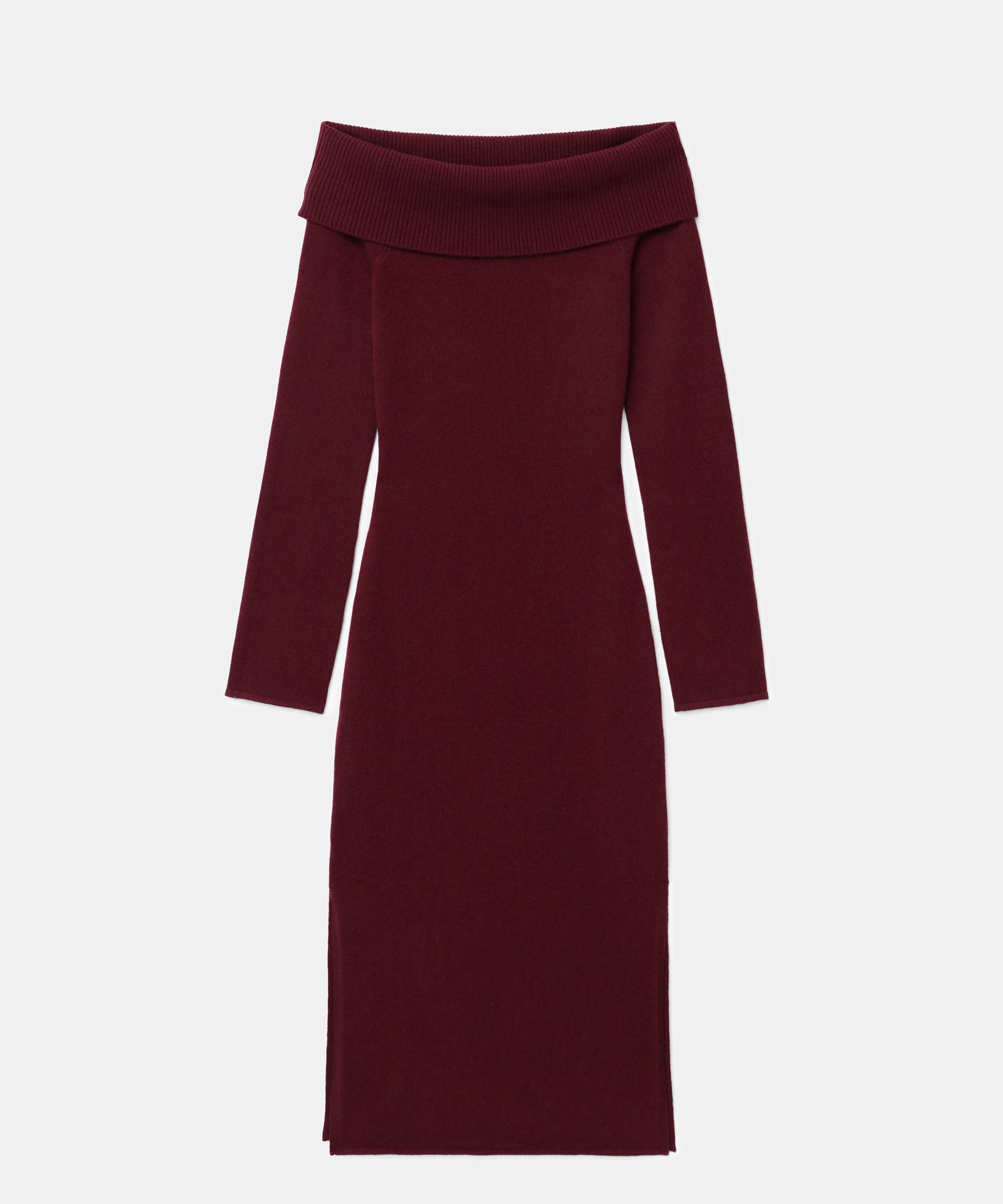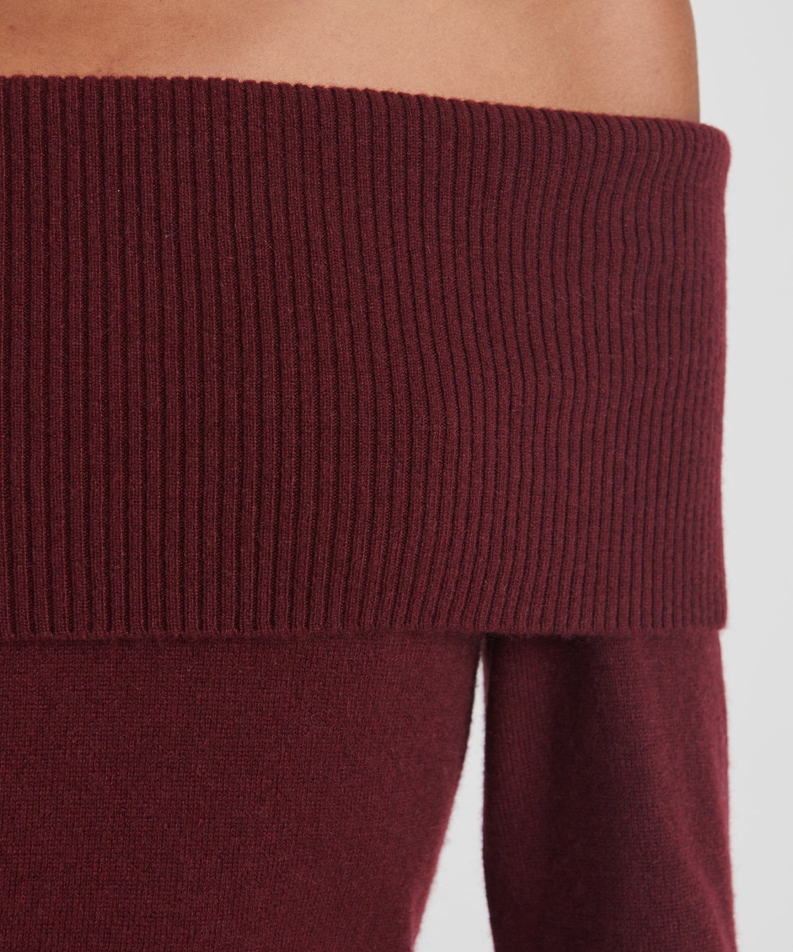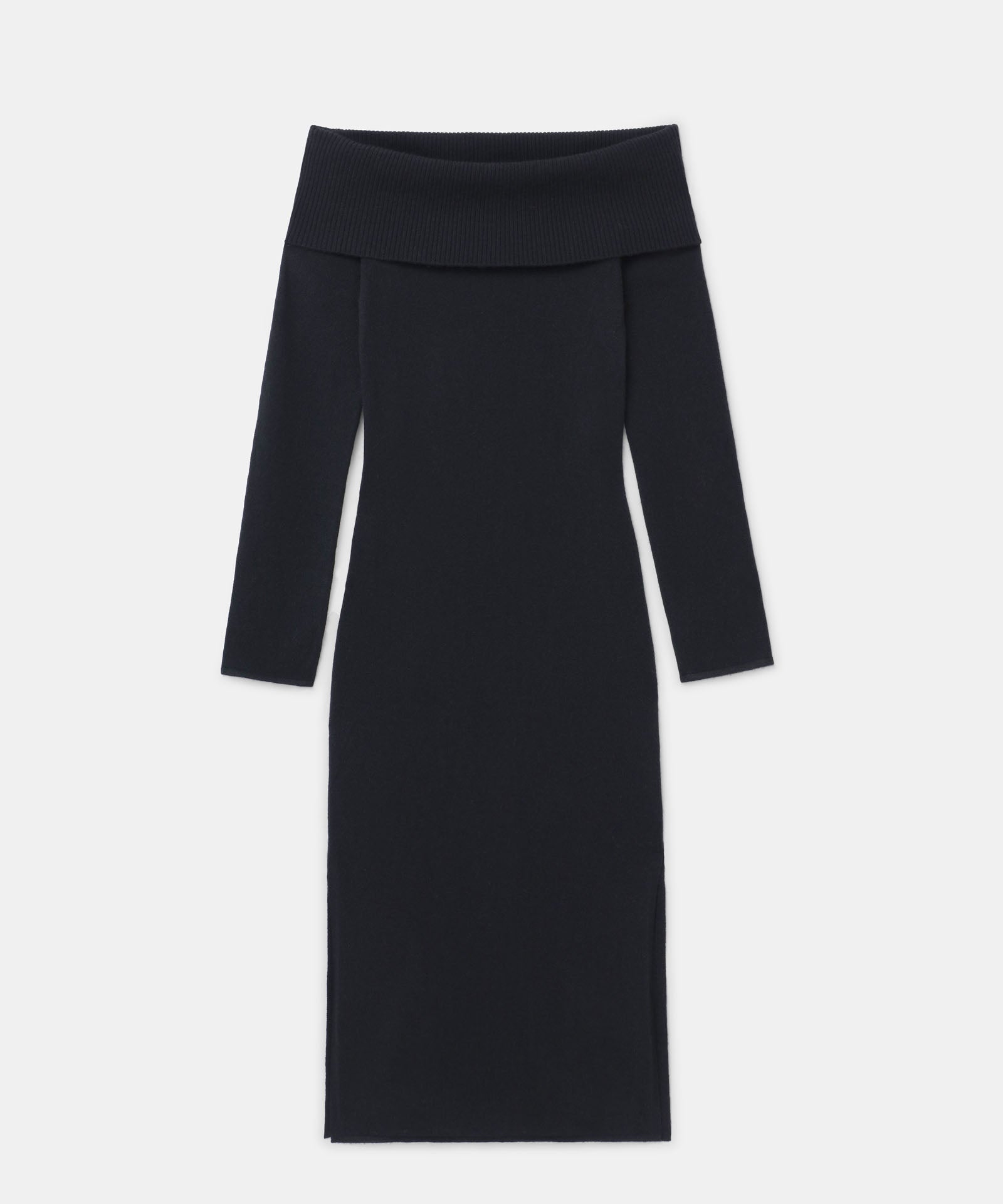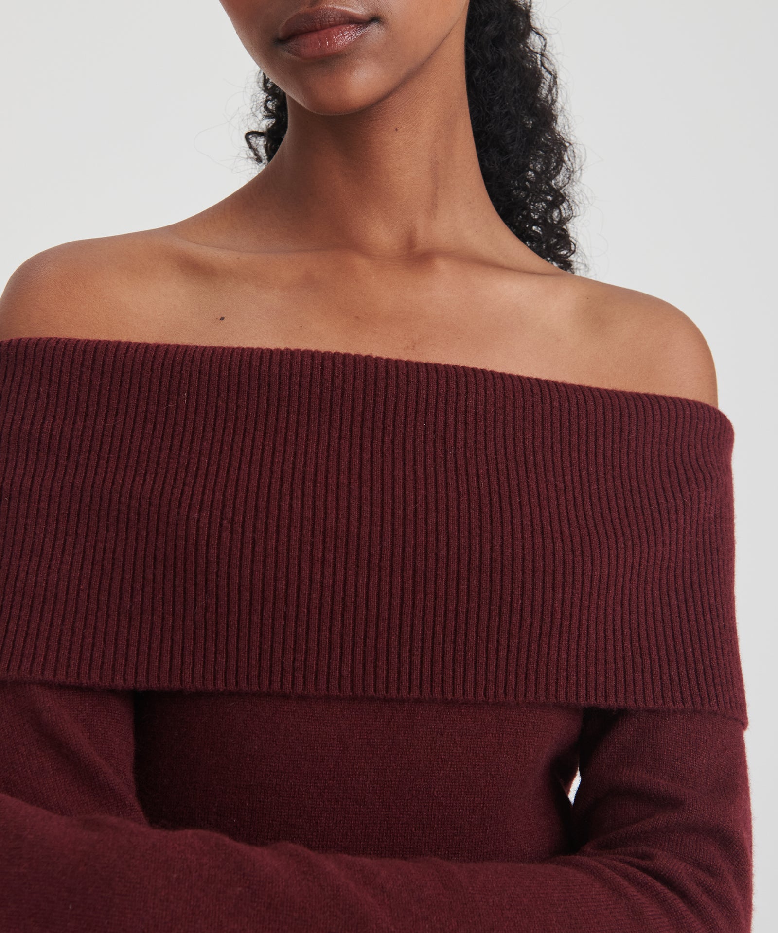 El vestido de cachemira con hombros descubiertos es un elegante vestido midi ajustado. Presenta mangas largas, detalles acanalados y un escote amplio con hombros descubiertos y una banda de sujeción oculta que evita que se suba o baje. Confeccionado con 100 % cachemira sostenible de primera calidad.