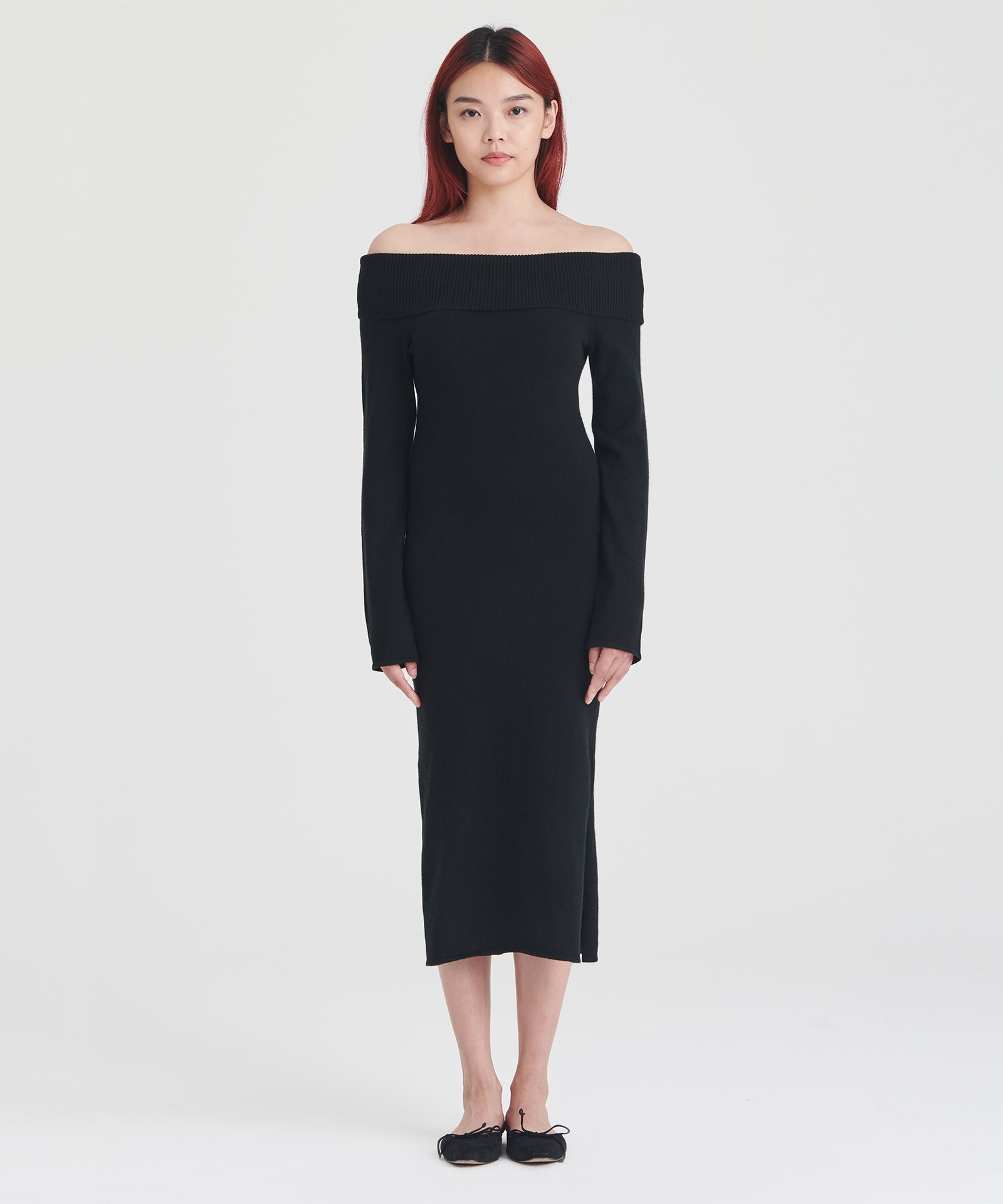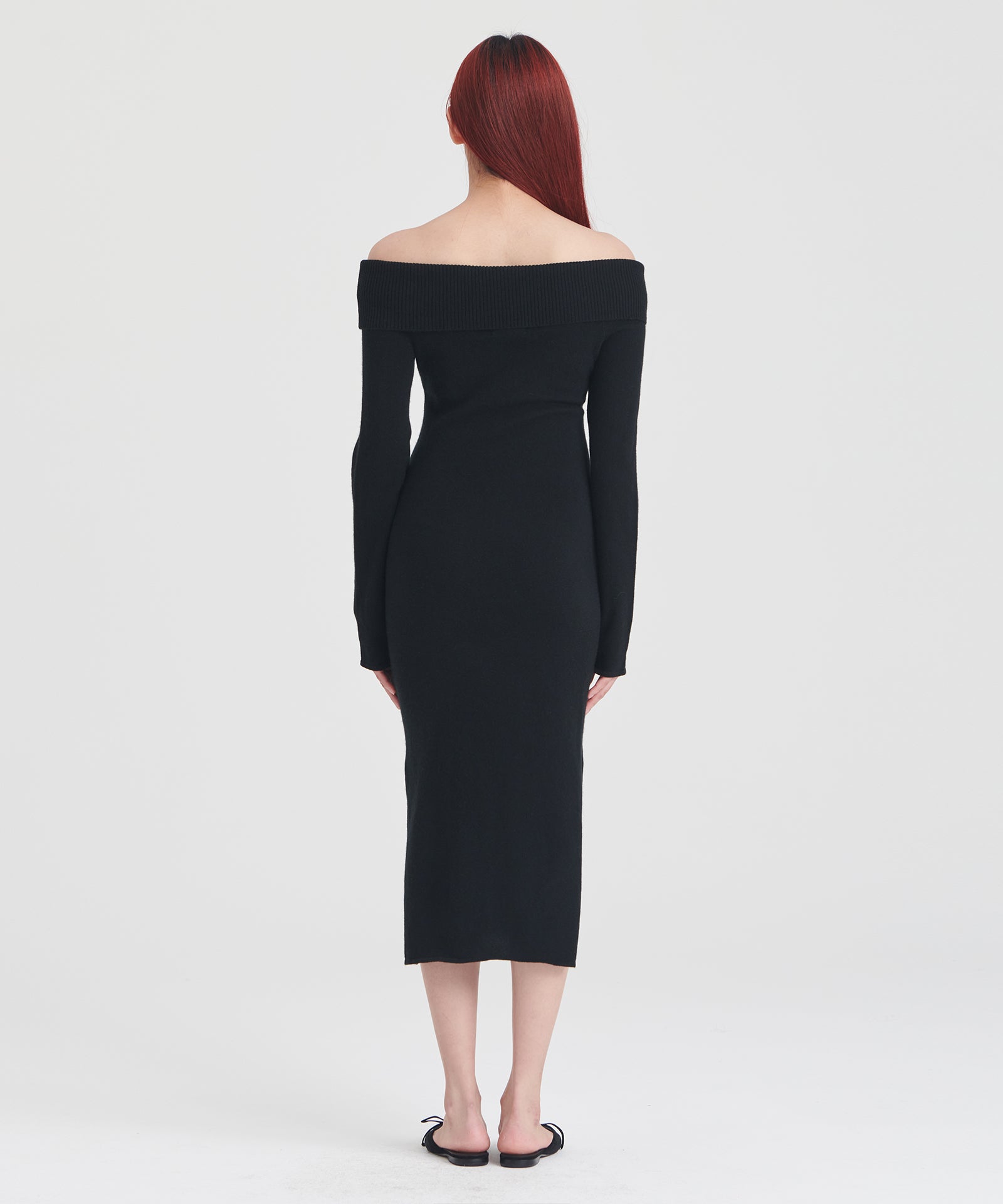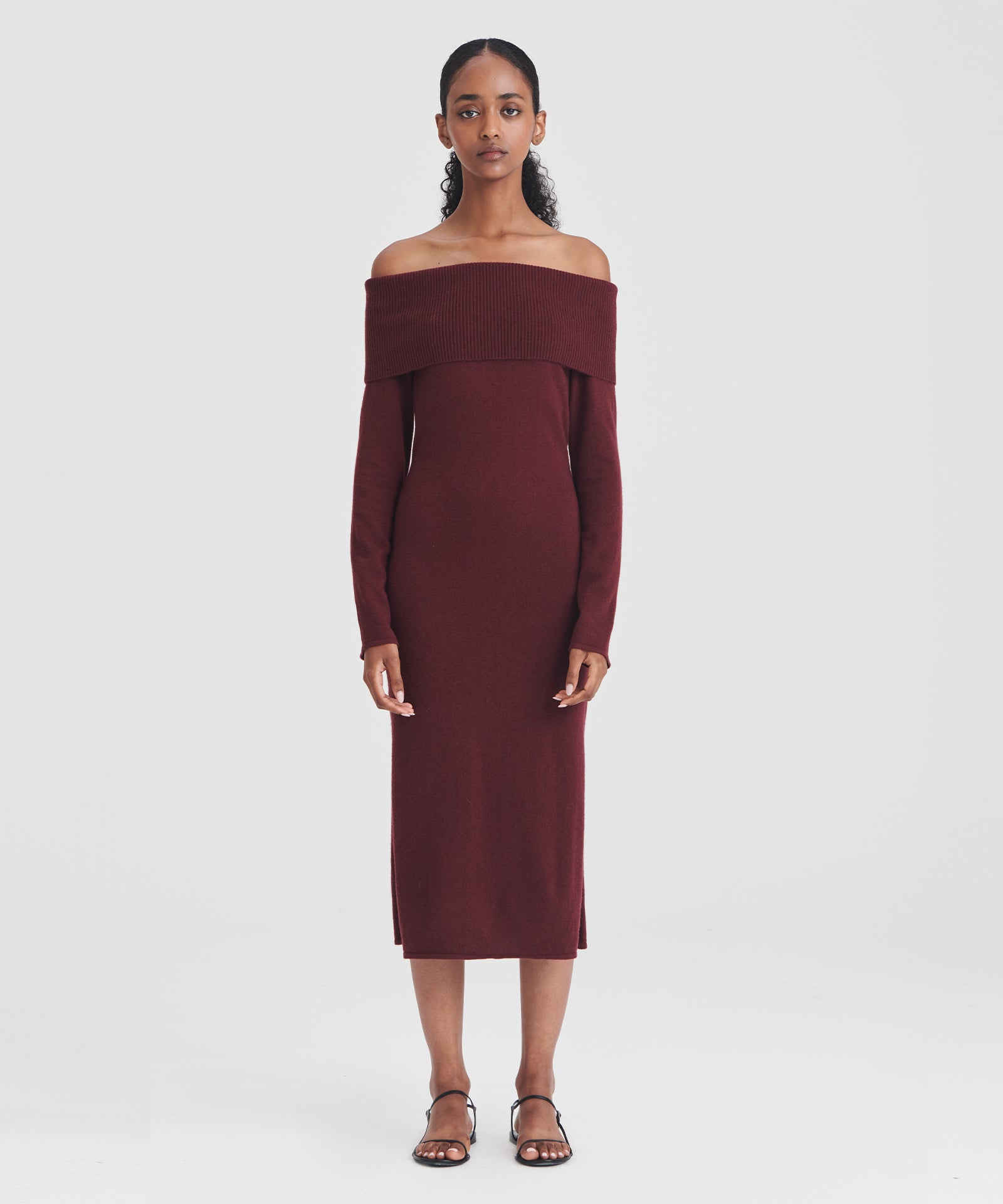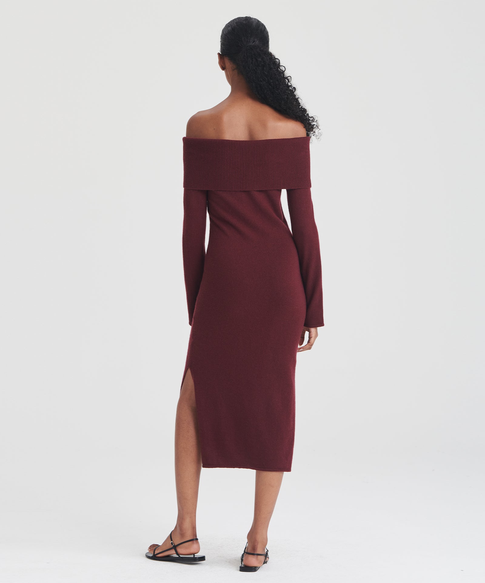 El vestido de cachemira con hombros descubiertos es un elegante vestido midi ajustado. Presenta mangas largas, detalles acanalados y un escote amplio con hombros descubiertos y una banda de sujeción oculta que evita que se suba o baje. Confeccionado con 100 % cachemira sostenible de primera calidad.